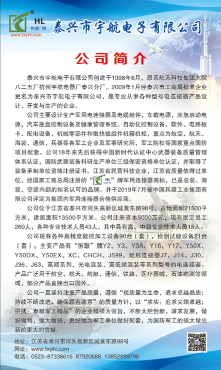 公司位于江蘇省泰興市河失高新區(qū)城黃東路98號(hào),占地面積21500平方米,建筑面積13500平方米。公司注冊(cè)資本5000萬(wàn)元,現(xiàn)有固定員工260人,各種專(zhuān)業(yè)技術(shù)人員43人,其中具有高、中級(jí)專(zhuān)業(yè)技術(shù)人員15人。公司現(xiàn)有各種高精度數(shù)控加工設(shè)備90臺(tái)(套),檢測(cè)試驗(yàn)設(shè)備21臺(tái)(套)。主要產(chǎn)品有【恒聯(lián)牌】Y2、Y3、Y3A、Y16、 Y17、Y50X、Y50DX、Y50EX、 XC、CHCH、J599。 矩形連接器J7、J14、J30、J36、J63,高頻系列,光電混裝,高低頻混裝等系列型號(hào)的電連接器。產(chǎn)品廣泛用于航空、航天、航艇、通信、鐵路、醫(yī)療器械、石油勘測(cè)等領(lǐng)域,部分產(chǎn)品直接出口國(guó)外。